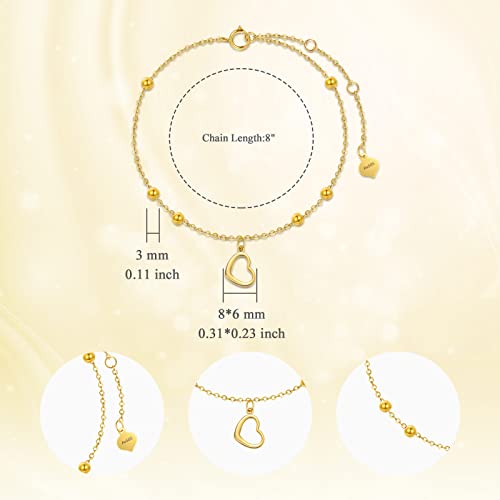 14kt Real Gold Heart Bracekets, Simple Gold Dangle Heart Bracelet Jewelry for Women, Mom Wife Girlfriend, 6″-8″