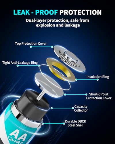 【Protection Comes First】Nimh aa rechargeable batteries lock in power with leak-proof, corrosion-resistant DBCK steel shell high-density seal. Reliable at -68 °F to 140 °F for safe year-round use, indoors/outdoors, and no overheating during charging
