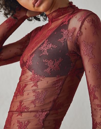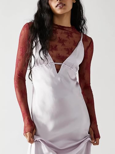 KMBANGI Women’s Mesh Long Sleeve Top Mock Neck Sheer Blouse Floral Lace Layering Tops Y2k See Through Tee Shirt